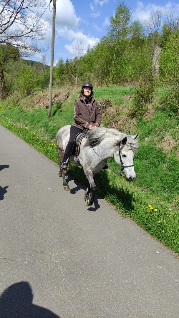 Aegidienberger mare, 4 gaited with lots of natural tölt similar to an Icelandic mare. Icelandic mare for leisure and sport - Bambita is a lovely and people-oriented 12 year old Aegidienberg mare. Born in 2012 at the Aegidienberg Gaited Horse Stud (GPZ), she is by Pescador von Aegidienberg x Boquita (by Soberbio). Bambita is 145 cm tall, 4 gaited with a lot of natural tölt, which is comfortable to sit and can be ridden from slow to brisk medium speed. Her tölt has a clear beat with good uprightness and high action. In addition to her diligent walk and ground covering trot, Bambi has a well jumped canter, which she can do on both hands. Bambi is a horse that does not need to be driven, that moves forward well, but only as quickly as her rider wishes. She can also be ridden on a loose rein at a walk. She is always easy in the hand and can be stopped at any time. A great horse for rides, alone or in a group. She is not bothered by dogs walking freely alongside the horse. She also knows cows, as well as tractors, trucks and trains. But that's not all. She also works enthusiastically in the riding arena with, for example, rideability and light working equitation trail. You can shine with her on the oval track, especially in multiple gaits, four gaits and tölt tests. So far I have competed with her in 2 gaited horse competitions, including the German Gaited Horse Championships, and have come 2nd or 3rd in all the competitions I have ridden her in. In Wickrath, Bambi became German runner-up of the Aegidienberg horses with me in 2023. As a young horse she was rated 8.08. She has not yet been bred. Bambi is easy to ride, but not a beginner's horse. Her rider should know the rider aids and have some tölt experience. She is lovely to handle but a little sensitive. She is easy to handle, can be loaded well, stands well on the mounting aid when mounted, knows how to stand in front of the café with other horses in the tie-up. Bambita is eczema-free. Bambi will only be sold in an open stable with horses, as she does not feel comfortable in a normal box in the long term. (Weekends in the box are ok for her.) This is also the reason why I am giving Bambi away with a heavy heart after one year. Unfortunately, I can't offer her an open stable (I only have a box with 5 hours of paddock in winter and 10 hours of pasture in summer, no possibility of converting. I only have one other horse). Bambi lived with the previous owner for 9 years in an open stable with a larger herd and felt very comfortable. Bambi's high-quality accessories (Hrimnir, Equest, Sportsfreund) are in very good condition and can be purchased in full or in part.