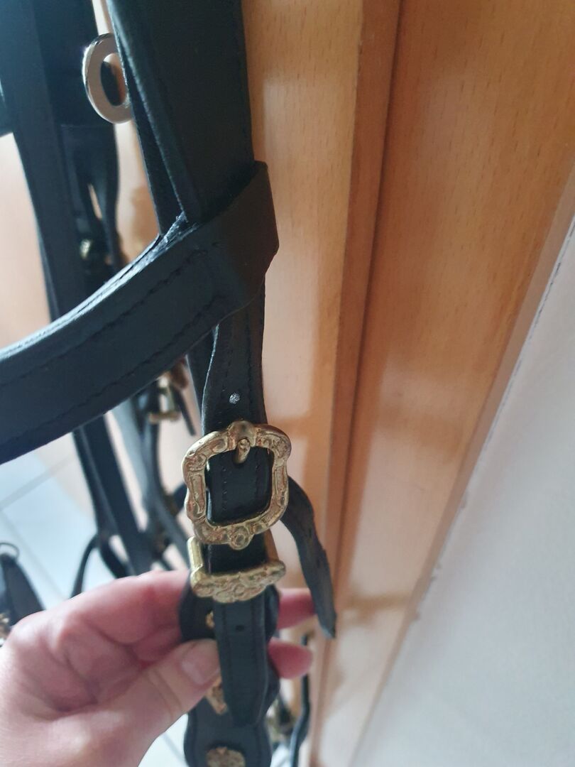 Baroque snaffle full, black-gold, officer's bridle, as new condition - I am offering a black baroque bridle with gold-colored fittings. It is size full and has only been used once as my horse is a little sensitive to the decorative element on the head. It is freshly cleaned and greased. A real eye-catcher. Matching closed reins are included.