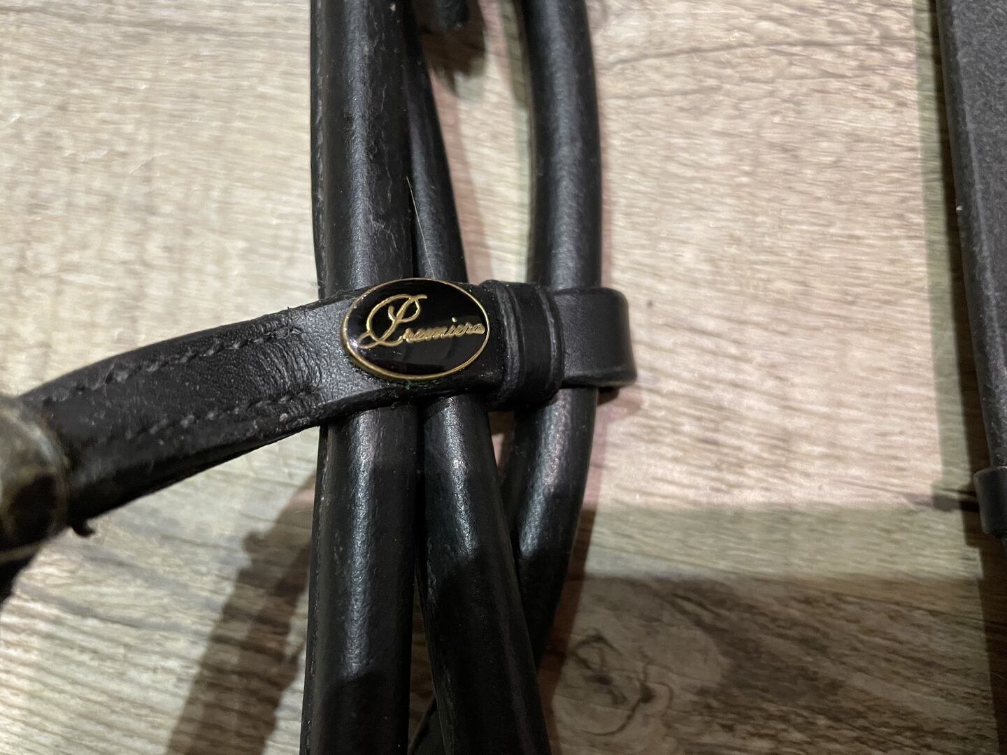 - round stitched - colour: black - size: thoroughbred - soft leather - with matching leather reins - rhinestone browband, unfortunately a few stones are missing, but it is not noticeable, you can also add new stones - unfortunately I can't find the bridle any more, I have always used it without a rhinestone. - good condition