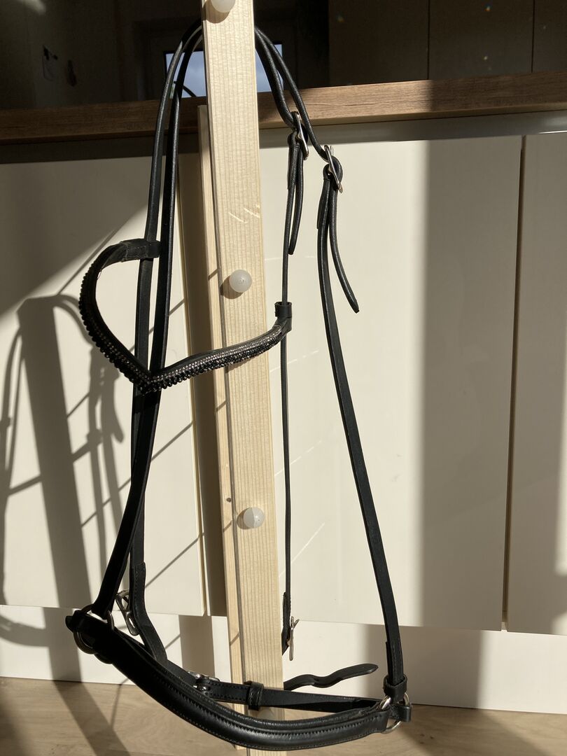Caveson with noseband for Icelandic/Spanish horses - Beautifully delicate, as new noseband with noseband and discreet, v-shaped glitter browband, ideal for Icelandic or Spanish horses. Hardly used, so the leather is still a little stiff.