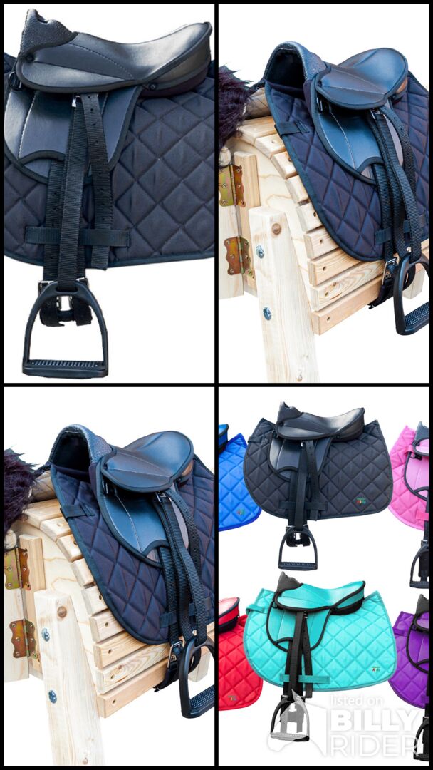 Size: approx. 10 - 12 inches Total seat approx. 34 cm pure seat approx. 22 cm long chamber width approx. 19 cm girth length 55 cm the set is suitable for a belly circumference of 120 cm to 145 cm Scope of delivery My little Pony saddle saddle girth Stirrups and stirrup leathers Saddle cloth Colors: black red blue pink purple