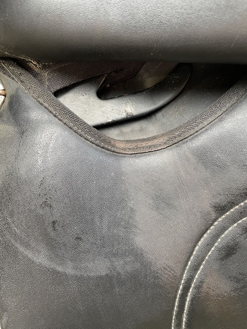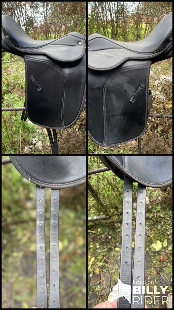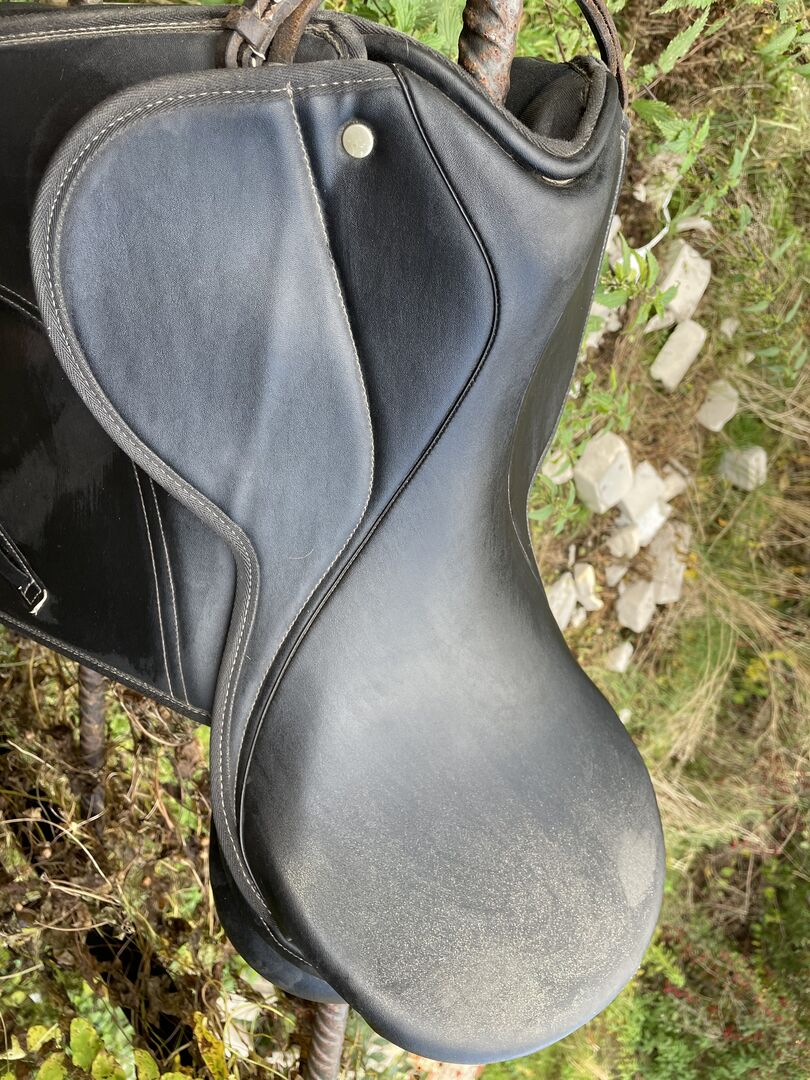 Dressage saddle 26/28 chamber, 17 inch - Hello Selling my comfortable dressage saddle due to switching to treeless saddles. It is probably from Thorrowgood. Unfortunately I can't see any brand name, but the sticker under the saddle flap speaks for Thorrowgood. It has a 26 or 28 mm gullet, gullet plate is not changeable (possibly by a saddler but no guarantee). From the material it is like Wintec and also so comfortable. The girth straps are still in good condition. Flexiblocks are also included to adjust the pommels. The saddle has a small damage at the Hinterzwiesel, but does not restrict the use.