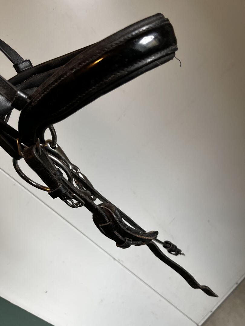 English snaffle with bit - Sell here my English snaffle without locking strap. It has an anatomically cut neck piece. The noseband is slightly wider and with varnish on top. The browband is missing a few stones as you can see in the pictures. The double broken water snaffle is sold with (14.5cm). The leather is not brittle or tight. The bridle is used. Will be cleaned again before sale.