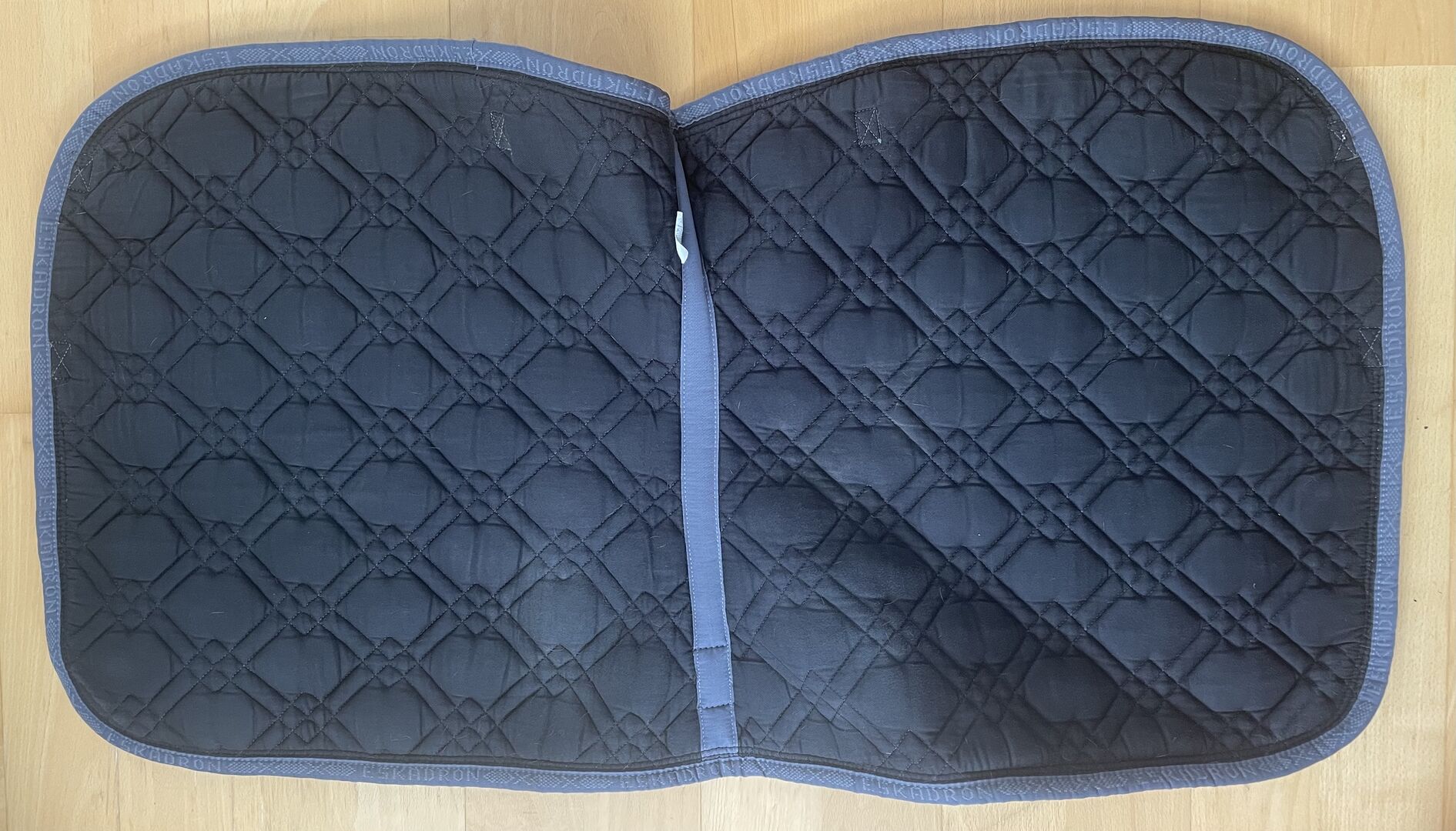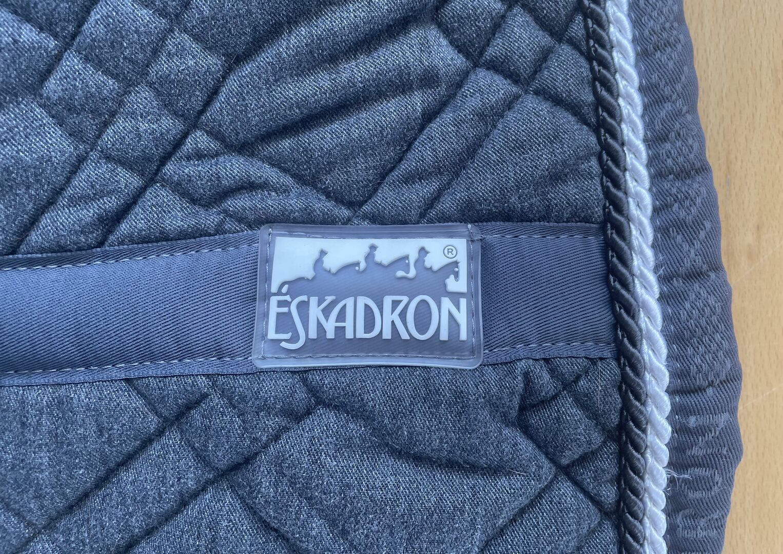 Eskadron Saddle Pad, WB Dressage, Grey Melange - For sale a very nice used Eskadron saddle pad, size warmblood dressage in the rare color grey melange. Exceptional quilting, the two bits are dark gray and white, the gray edging includes the Eskadron lettering. The saddle pad is functional but has slight signs of wear such as roughened areas on the edging (see detailed photos).