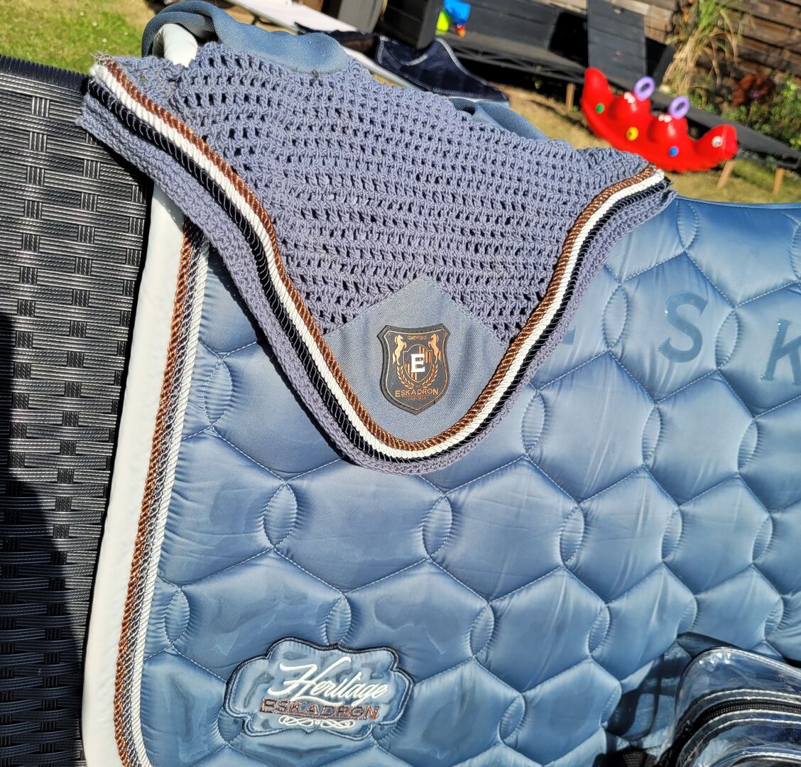 Eskadron set light blue - Used set from Eskadron in light blue (Heritage collection). Everything freshly washed. !! Color differs slightly from the original in the pictures. The shade of blue is the same in real life, all from one collection !!! Included are: - Eskadron jumping saddle pad: VS - Matching Eskadron bandages: Full - Matching Eskadron fly ears: Full