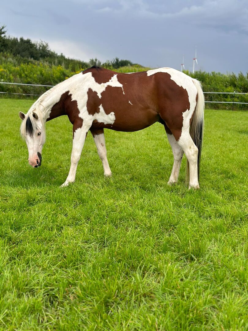 Fantastic Paint Horse gelding with a very sweet character - Location: 22115 Hamburg Cats Gotta Colonel - this eye-catcher, born in 2020 with a height of 153 cm, attracts everyone's attention with his great coloring and his two blue eyes. But his character is also wonderful, very sweet and people-oriented, well-behaved and he has never been angry. Cats loves children. He is used to being kept in boxes and open stables and is healthy. The gelding was gently broken in by a professional at the age of 3.5 and has solid basic western training. He has started with reining maneuvers (spin, sliding stop). But his favorite thing to do is to go off-road. Whether in a group or alone, he is always manageable and can be ridden on a long rein. Due to his uncomplicated nature, he is also suitable for youngsters and beginners. He has American Half Quarter Horse papers. Cats is ideal for ambitious leisure riders. Will only be sold to a 5-star home due to acute lack of time.