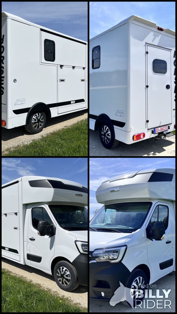 Body: self-supporting, fully insulated sandwich box body for 2 horses standing against the direction of travel with aluminum partitions, removable, padded hangings, side ramp with non-slip coating with extended flap above, MSG special floor made of PP with non-slip plastic coating and glass fiber insert, rear center door, large glass skylight, 2 grilled side windows, el. glass roof window, 2 grilled side windows, el. fan, white/blue light in horse compartment, video surveillance horse compartment / rear view camera, changes automatically, separate tack room with bridle holder, saddle holder, mirror, storage space above the driver's cab, vehicle completely foiled,