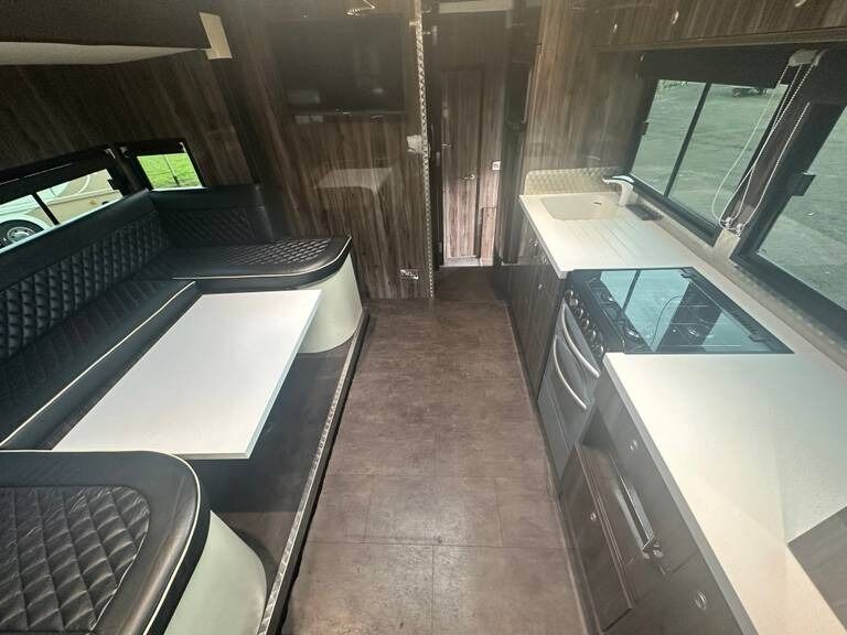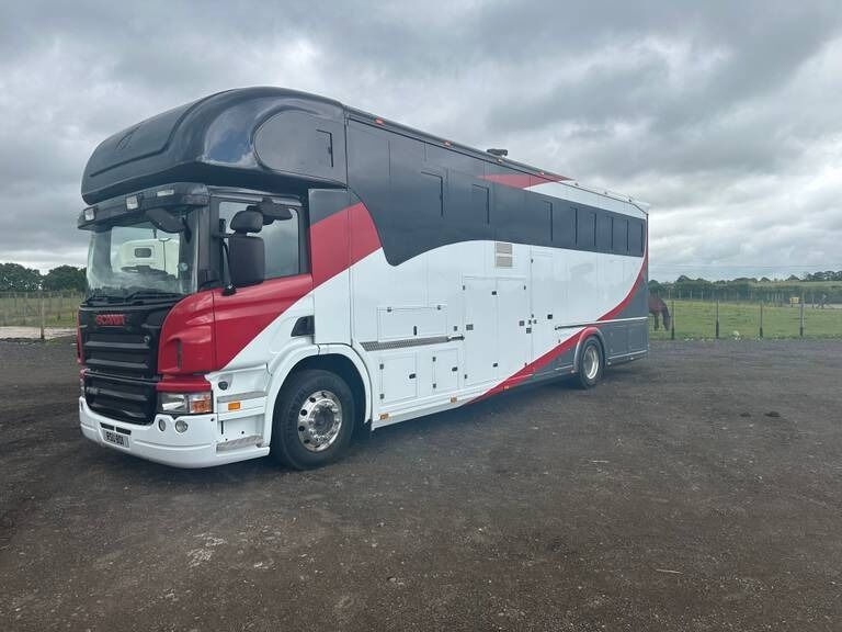Type Horsebox Manufacturer Scania Model Name P310 Weight +7.5t Facilities Tack locker, Skirt lockers, Water tank, Toilet, Shower, Heating, Generator, Electric hook up, Hob, Cooker and TV Sleeps 4 Number of Horses 5 Living Overnight Condition Used Description Overview • 2006 Scania P310 18,000 Kg Chassis • Coach built by Annard in 2017 • Stalled for 5 • Electric slide out • Underfloor storage Chassis and Engine • 2006 Scania P310 4X2 • Engine size:8970cc • Gross Weight: 18,000 Kg • Mileage: 47,873 Miles • Manual Gearbox • Rear air suspension • 310 BHP • Heated Mirrors • Cruise Control • Adjustable Drivers Seat and steering wheel Living • Sky Light • C Shaped Leather seating-converts into a double bed • Double bed above drivers compartment • Fridge with Freezer • 32” TV • Spniflo Caprice MKIII Cooker and hub • Russel Hobbs Microwave • Fitted worktop with built in sink • 240V Sockets • LED Lighting • Electric slide out • Spotlights • Dining Table • Multiple fitted storage compartments • Wardrobe Bathroom • Shower • Hand Basin • Toilet Horse • Stalled for 5 • Aircon • Tie rings • Rubber flooring • Electric rear loading door Exterior • Custom black, red, white and grey livery • Under floor storage • Tinted windows • Large tack lockers • Alcoa Durabrite Alloys • LED Taillights