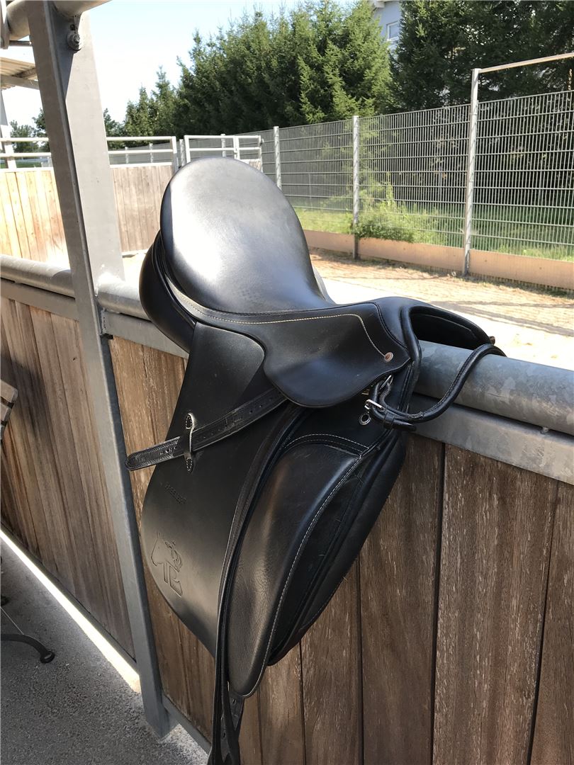 Hubertus Schmidt Dressage Saddle - The Hubertus Schmidt II dressage saddle by Passier is an advanced dressage saddle with bright, elegant decorative seams. The thigh rolls are 1 cm thicker than the previous model and make it easier to keep the leg in the correct position. The soft, deep seat makes the saddle extremely comfortable to sit on. The 'Lifter-Sattelkissen' is particularly horse-friendly and lies perfectly on the horse's back, even on horses with high withers. With PS saddle tree. The chamber width is adjustable. The very well preserved dressage saddle for sale because of equestrian task. The saddle is 3 years old and was used little, therefore still very well preserved. Size see pictures, the chamber width is adjustable.