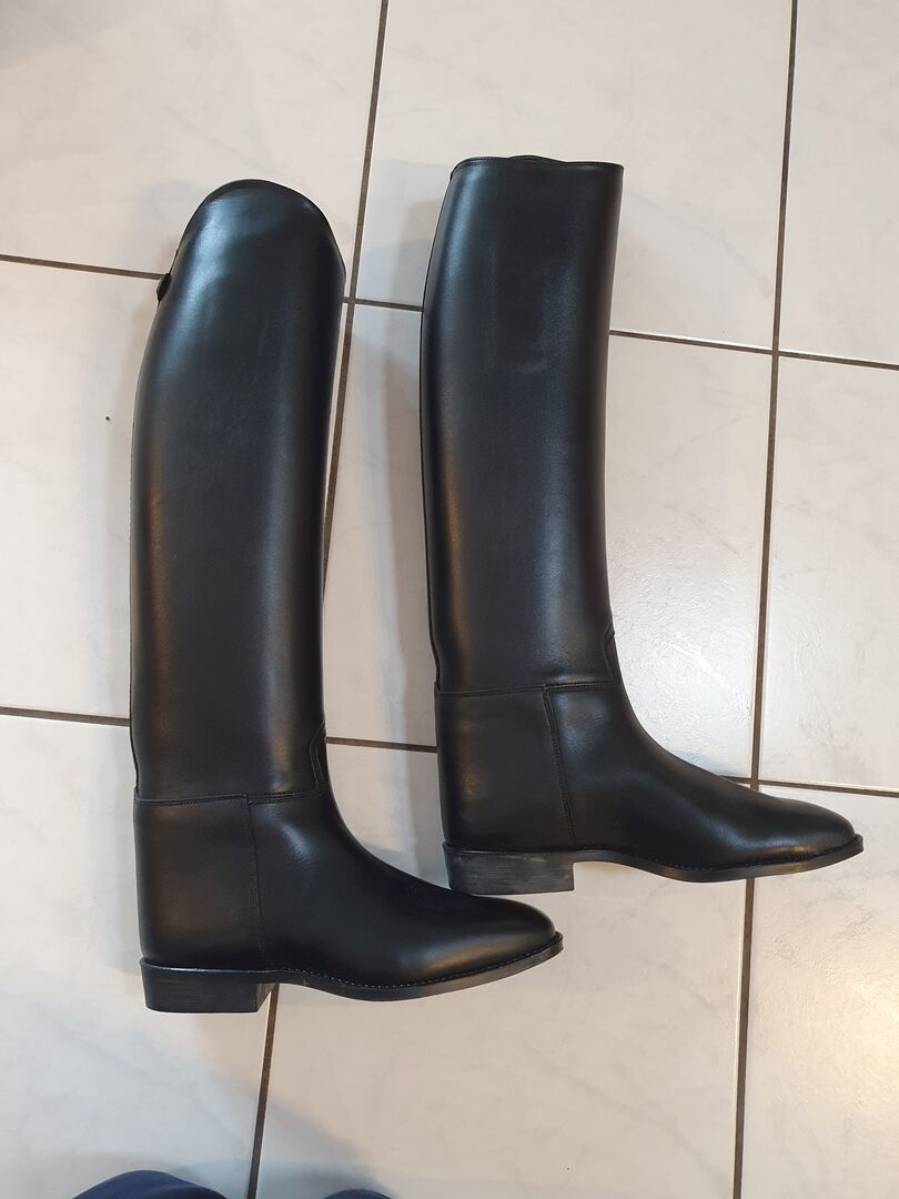Leather riding boots from Cavallo, new, 6/ 51/ 36 - Unused black leather riding boots with supergrip sole , shock absorber in heel and stiff shaft. They are without zipper. They have got from the fitting at the time unfortunately from the boot jack in the back light scratches, likewise one shoe has a scratch in front. Therefore so cheap.