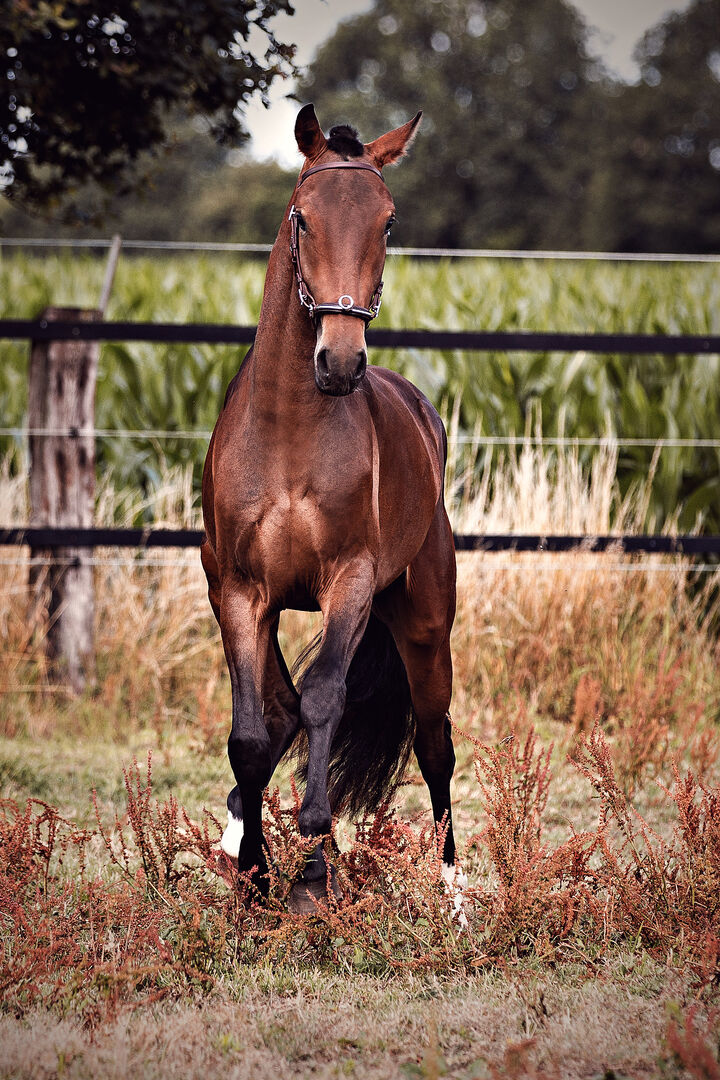 Quartzo is a real rock in the surf. He spent his first two years of life in Portugal completely untouched in the pasture. He is a picture of a Lusitano with a typical head and harmonious build. Although Quartzo has not been stabled for long, the lad behaves absolutely sweet, cooperative and extremely uncomplicated. His good-natured nature impresses me every day anew. He cooperates very well and can already be led reliably and well behaved. Based on his current size, his final height is estimated to be about 1.62 m. He has been in Germany since mid-June where he is learning the usual young horse basics and etiquette. He has a Blue Book without pedigree (Cruzado Portuguez).