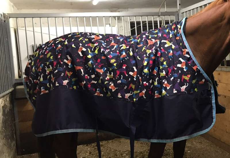Outdoor blanket Highneck 145cm 200g - Sell new outdoor blanket from Felix Bühler with high neck in 145cm and 200g filling. The blanket is dark blue with cute colored dogs on it. Shipping costs 5€.