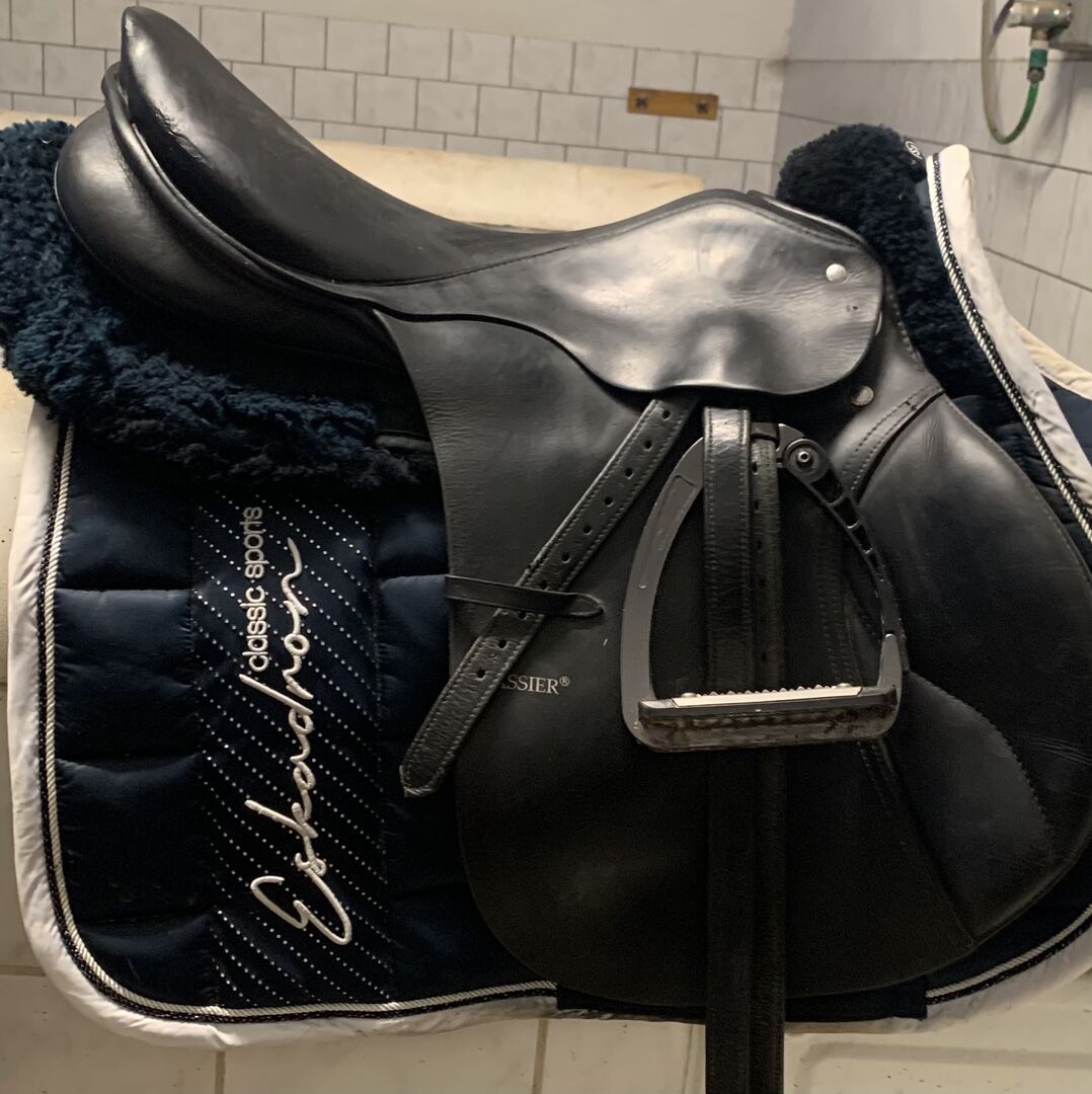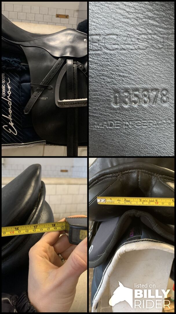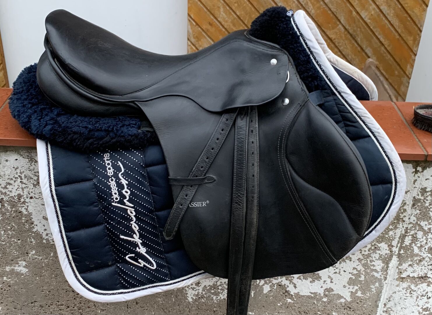 Passier Jumping Saddle Pegasus - Passier jumping saddle, model "Pegasus," black, 17.5", medium chub, semi deep seat, top-maintained, a small quirk on the piping, which was repaired, as well as an abrasion on the left chub (see photos), last year completely new padded. KW approx. 33, can be altered by saddler, fits almost any horse. Stirrup leathers (photo) can be included. Viewing of course possible, trying against deposit of the purchase price. PayPal available, shipping possible.
