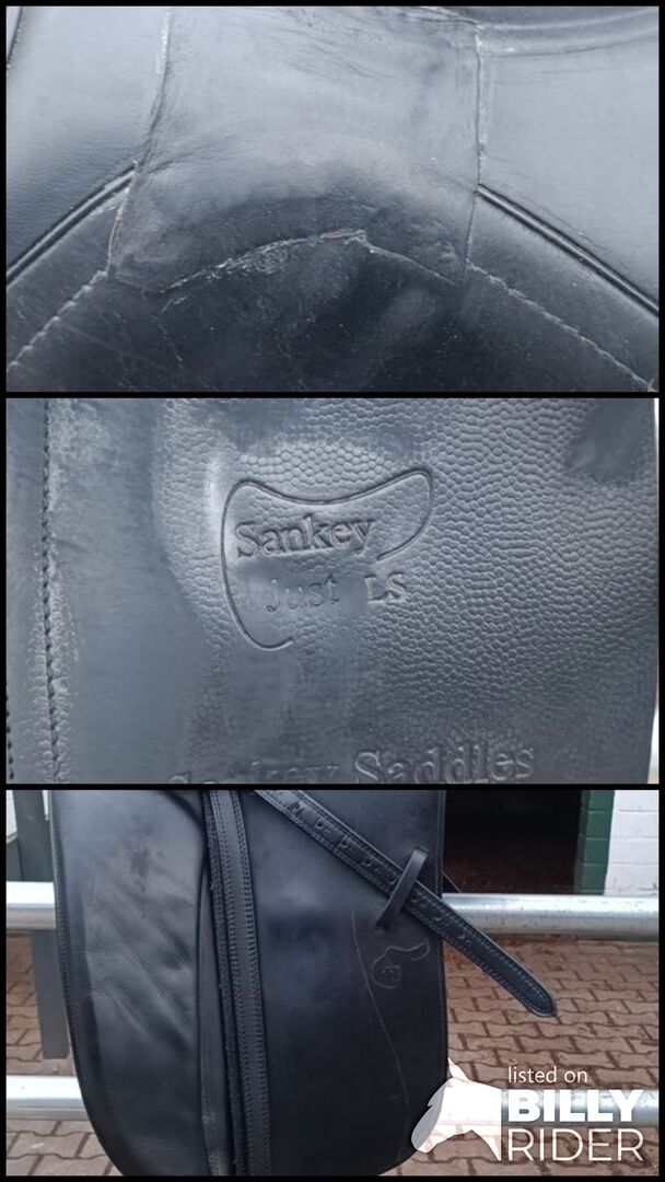 Sankey Just L/S dressage saddle 17.5" - Used, very comfortable dressage saddle from Sankey Anke Just, year of manufacture 2013. Seat 17.5", KW 33. Fits well on round-ribbed horses with pronounced shoulders, the deep seat puts the rider close to the horse. As can be seen in the pictures, the saddle has signs of wear, including the glued patch. It is merely a blemish, as several saddlers have assured me. The saddle was upholstered in November 2023. The saddle is no longer in production, as researched online, the new model is priced at 4200€.