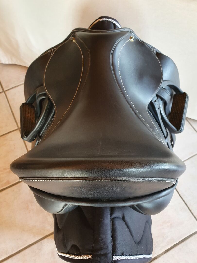 It is not only super comfortable but also totally beautiful with the decorative stitching. Due to the changeable gullet plate, it is also adaptable to the horse. Currently, the blue gullet is installed.