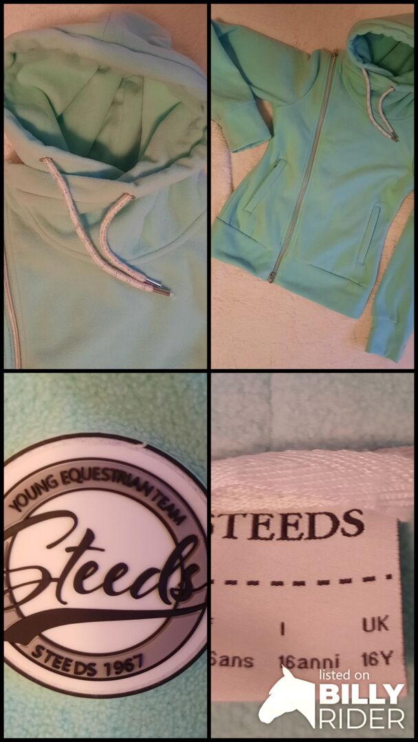 STEEDS kids teens fleece jacket, mint green-gr.176 - - very neat, cozy fleece jacket with large hood - WITHOUT PILLING (see photos) - asymmetrical 2-way front zip -2 front zip pockets -thumbhole at the cuffs -hood is adjustable by cords -comes from a well-kept pet-free non-smoking household -shipping possible if costs are covered