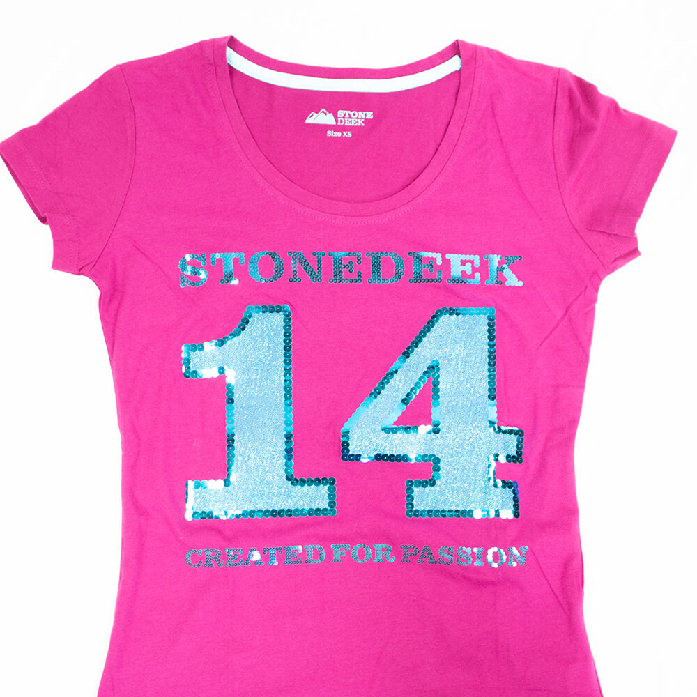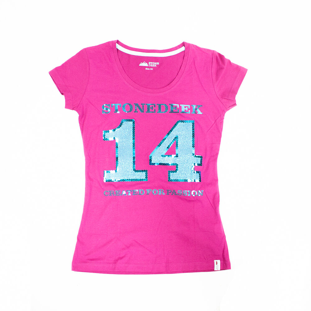 T-shirts from Stonedeek are perfect for everyday life in the stable. The top has size XS and is pink. The shirt has a large 14 on the front, which consists of sequins and glitter. The shirt is as good as new.