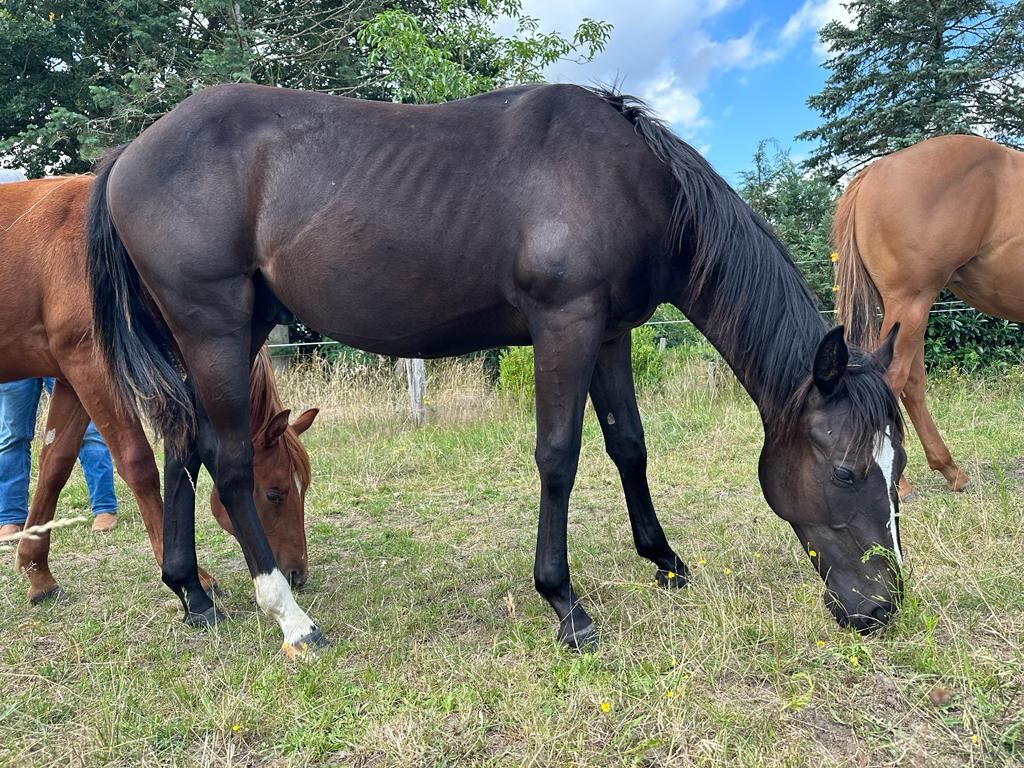 very dear, cuddly Quarter Horse yearling in black - Spirit is a beautiful Quarter Horse yearling stallion in the great color black. But he scores not only with his color, but also with his stunning character. He is super people oriented, very well balanced, always friendly to people and animals and well behaved. He loves his cuddles and demands them. Spirit was born in 2022 and is expected to be 154 to 156 cm tall. He has a good conformation and shows great gaits. The stallion is growing up in the herd and knows everything that should be known at his age. Is halter trained, knows the farrier and vet and is cool with them. Spirit has a good all-round pedigree. Later, the little one will certainly be a real eye-catcher. His field of application will be in the all-round area or he will become an absolutely cool partner for leisure time activities. Come by, have a look and fall in love!!!