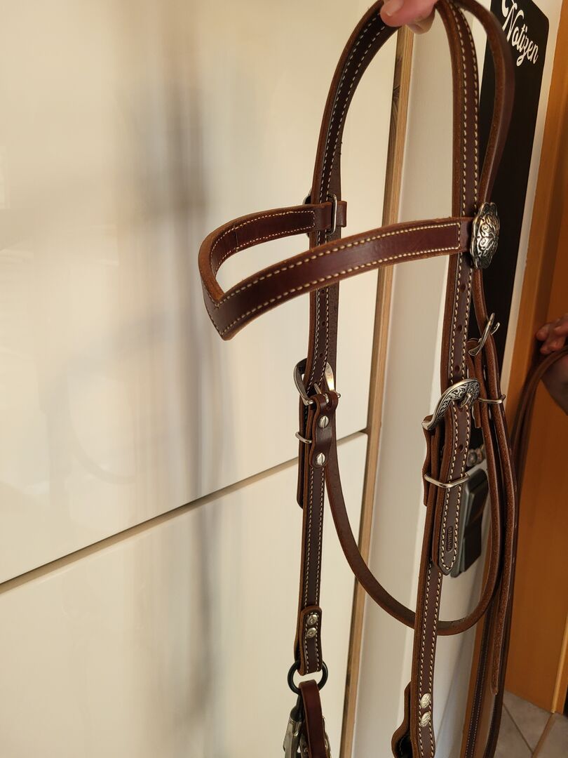 Western bridle - Selling my new unused western bridle made of the best leather and with beautiful decorations. It was bought at the Amerikana and is not a cheap product. NP bridle: 259€ NP reins: 199€ (total 458€) RETAIL PRICE: 199€